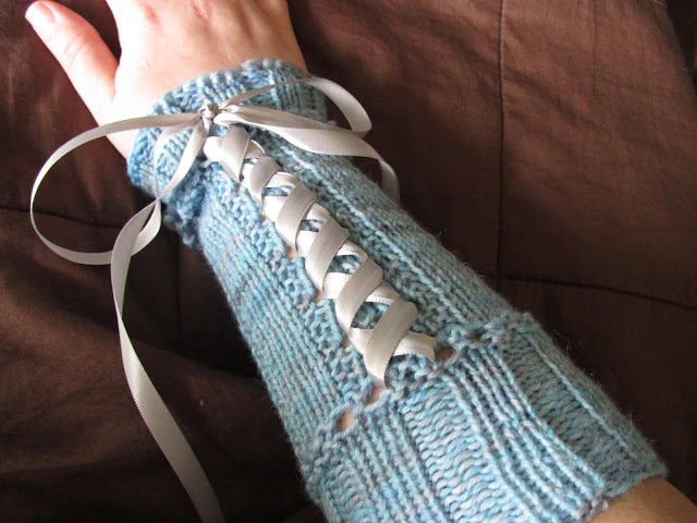 I love how this version came out! The yarn had been a gift from a Raveler who knew what a hard time I was going through back in December, and I love that I've been able to use it in something special. I tweaked the pattern a bit to space the ribbon holes out more and make the whole thing a little longer, and the lighter weight is nice for spring. I'm working on a version with an afterthought thumb, as well, so these could be fingerless mitts instead of wristwarmers if so desired. I like some versatility in patterns, and hopefully others do, too! I'm currently looking for a couple of people to test out the different versions of this (worsted or DK, with or without thumbs) so if you're interested please let me know, I'd appreciate the help!